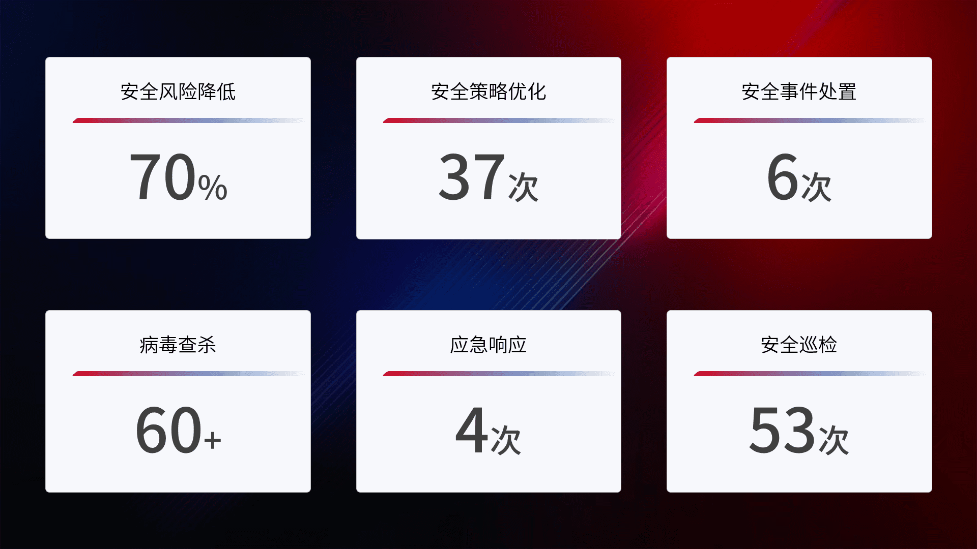 提供全面的安全事件报告体系,,,包括处置报告、、、、周报、、、、季度和年度总结,,,结合持续监控,,,,帮助客户深入了解网络安全状况。。。